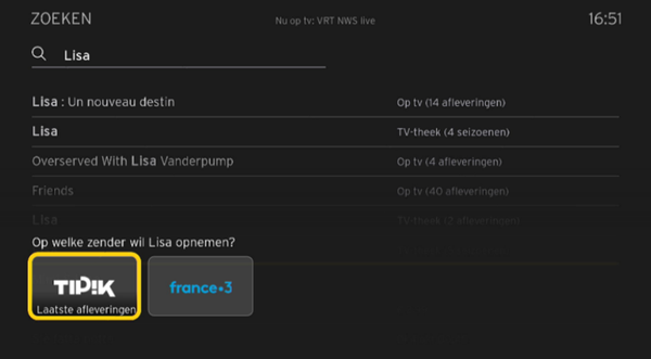 Dit werkt voor losstaande programma's en reeksen. In geval van meerdere opties zal men je eerst om een bevestiging vragen, door je keuzes te tonen in een (grafisch) menu. Daarna krijg je een bevestiging van welke opname (op welke zender) je gepland hebt.