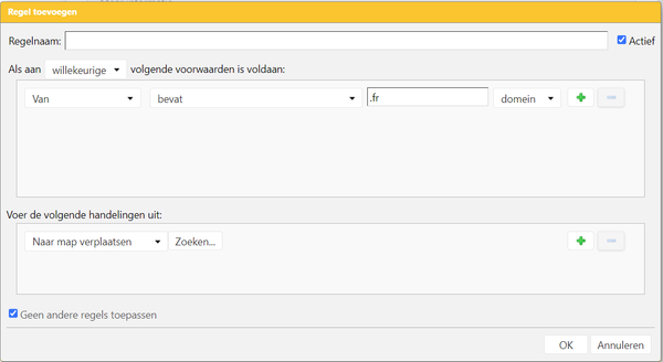 Wie kan mij helpen. Hoe moet ik mijn e-mail regels instellen om alle Franstalige e-mails met de extensie / domein .fr uit te filteren naar een specifieke map