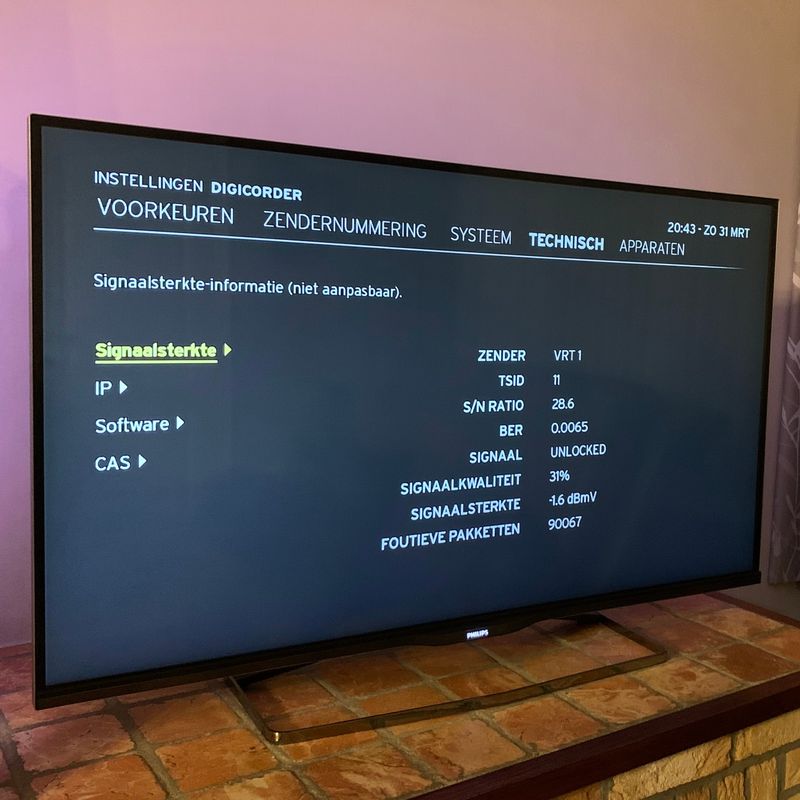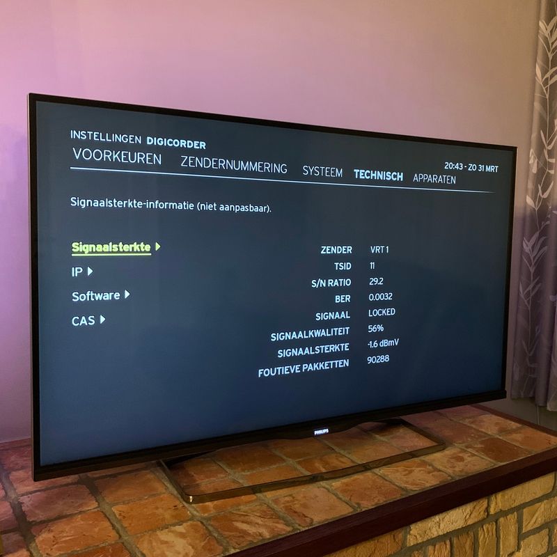 Ik heb eens naar de instellingen gekeken tijdens zo'n storing en mij lijk het signaal inderdaad erg zwak (zie afbeeldingen).
