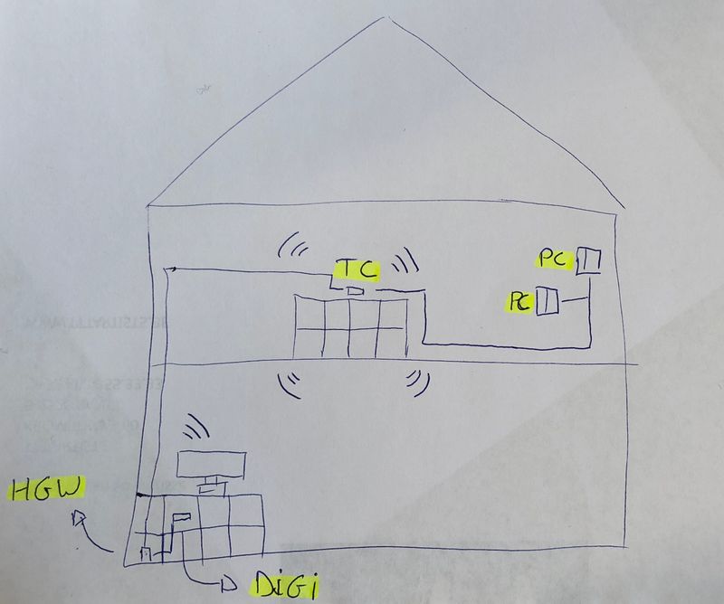 Ik heb beneden de HGW en boven de Time Capsule als access point staan. Omdat de HGW door zijn positie amper bereik uitzendt draait het meeste wireless verkeer al over de Time Capsule. Mijn ideaal plan is om de HGW om te zetten in een modem waarop de nieuwe router met meer range boven aangesloten wordt (volledige controle ligt bij mezelf). De Time Capsule kan dan blijven dienen als back-upschijf en access point beneden, op een betere positie dan waar de HGW nu staat, want die is niet te verplaatsen met de benodigde bekabeling.