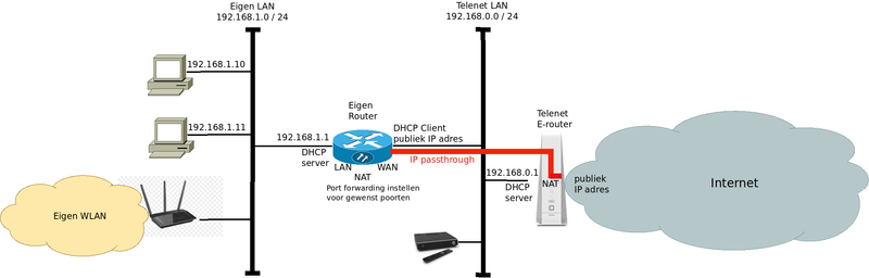 Als de IP passthrough (bridging) goed geconfigureerd is, dan ontvangt je eigen router op zijn WAN interface een publiek IP adres. Je hoeft dan enkel maar port-forwarding in te stellen op je eigen router, en niet op de Telenet router.