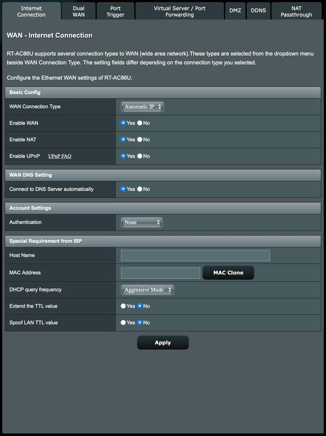 Ik heb mijn eigen Asus router in de DMZ geplaatst met het juiste IP adres.