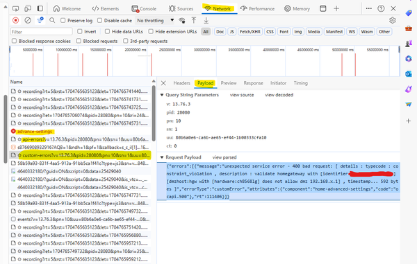 {"errors":[{"message":"unexpected service error - 400 bad request: [ details : typecode : constraint_violation , description : validate homegateway with [identifier:b4:f2:67:01:ab:1a] [dmzhost:hgw with [hardware:ch8568lg] does not allow dmz 192.168.x.1] , timestamp... 592 bytes ]","errorType":"customError","attributes":{"component":"home-advanced-settings","code":"ocapi.500"},"rt":111406}]}
