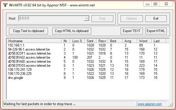 Ik ondervind al een aantal weken een constante packet loss, beginnend vanaf de eerste node in de buurt. Varieert tussen de 1-2%, zoals te zien bij een WinMTR test: