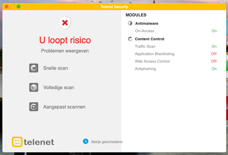 Ik heb Telenet Security geïnstalleerd en zou Application Blacklist en Web Access Control op ON willen zetten. Ik zie echter nergens de mogelijkheid om dit te doen.