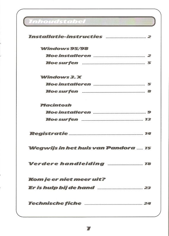 Toen ik klant werd (BEF 10.000, plus BEF 2.000 waarborg voor de modem), dat moet ergens einde 1999, begin 2000, geweest zijn, toen kreeg ik nog een installatiepakketje van Pandora, maar dat was toen niet meer via inbellen (wat ik tot dan toe via wanadoo.be en belgacom.net had gedaan), maar langs de kabel. Ik heb dat pakketje nog met de "bomma van pandora":