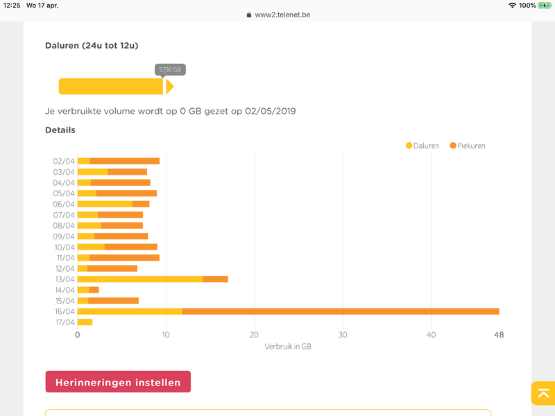 Je moet je niet excuseren. Ik probeer enkel maar te achterhalen vanwaar elke maand slechts 1 dag er een uitschieter van verbruik is? Bij Proximus was dit niet het geval en had ik een mooi dagelijks verbruik zonder uitschieters. Moest het zijn dat dit gaat over het updaten van toestellen dan kan ik moeilijk geloven dat al mijn toestellen en ik zeg dan wel alles wat updatebaar is op slechts één enkele dag gebeurd. Mijn gemiddeld maandelijks internet verbruik ligt bij Telenet ook bijna 100 GB hoger dan bij Proximus, zonder onze levensstijl te wijzigen. Dat mogen ze van mij gerust eens onderzoeken @Suzy 😉