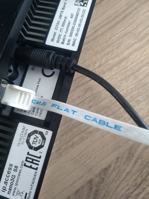Zoals je op de screenshots kan zien: Cat 6 Flat Cable. Ook is deze niet vlak naast de modem rechtop geplaatst, kan deze niet zo makkelijk vastmaken is de muur, waardoor deze meer centraal in de living staat, maar wel rechtstreeks verbonden is met een netwerkpoort in de muur.
