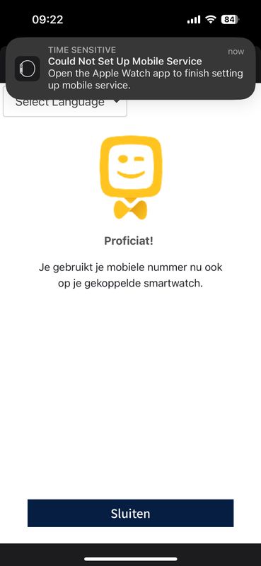 Zelfs met inactieve eSIM komt ofwel de boodschap dat er al een eSIM gekoppeld is. Heel soms doorloopt de procedure in de watch app wel (setup mobile service), maar dan komt op het einde een pop-up boodschap vanuit de watch app dat geen koppeling gemaakt kan worden (zie screenshot).