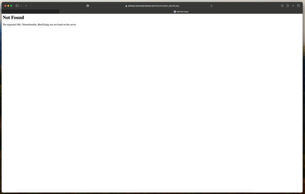 Dezelfde dag probeerde ik ook de installer te downloaden voor mijn MacBook Pro met Intel-processor (MacOS Intel) maar dat lukte niet. Ik kreeg telkens de beruchte "404 Not Found-pagina".